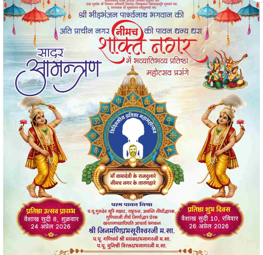 श्री शंखेश्वर पार्श्व पद्मावती धाम शक्ति नगर धनेरीया कला नीमच में स्थित नवीन श्री शंखेश्वर पार्श्वनाथ एवं पद्मावती मंदिर के प्राण प्रतिष्ठा महोत्सव दिनांक 24 अप्रैल 2026 से लेकर 27 अप्रैल 2026 तक के विभिन्न कार्यक्रमों का आयोजन खरतर गच्छाधिपति आचार्य प्रवर मणि प्रभ सागर जी महाराज साहेब आदि ठाना की पावन निश्रा में होना है, जिसके लिए स्पष्ट वक्ता गुरुवरया श्री गुणरंजना श्री जी महाराज साहब के पावन सानिध्य में श्री पारसमल जी मुरडीया के निवास स्थान पर पत्रिका लेखन का कार्यक्रम काफी धूमधाम से मनाया गया जिसमें श्री महावीर जिनालय विकास नगर नीमच से भव्य जुलूस के साथ पत्रिका लेखन हेतु उपस्थित हुए जिसमें प्रमुख रूप से श्री जम्बु कुमार जी सरावगी एवं श्री प्रेम प्रकाश जी पगारिया के गरिमामय उपस्थिति में ट्रस्ट के अध्यक्ष श्री देवीलाल जी नाहटा महोत्सव समिति के अध्यक्ष श्री शोकिन जैन ,श्री अखिलेश जैन ,श्री प्रीतम चंद जी खिमेसरा श्री गेंदमल जी पामेचा श्री रोशन लाल जी जारोली श्रिखब गोपावत,सुनील गोपावत , चन्द्र प्रकाश जी छाजेड अनिल जी बेगानी ,अनिल नाहटा ,मनोज झलोका ,प्रदीप लसोड़ ,श्री नवीन जी मोता श्री संदीप जी खाबिया,श्री संजय जी बेगानी, श्री नितिन कंकरेचा ,श्री राकेश पगारिया कमलेश गोपावत ,सुभाष गोपावत ,राहुल मुरडिया आशीष मुरदिया व कई अन्य वरिष्ठ लोगों के द्वारा पत्रिका लेखन का कार्यक्रम संपन्न किया गया,उसके पश्चात श्री शंखेश्वर पारस नाथ मंदिर जैन कॉलोनी श्री भीड़ भंजन पारसनाथ मंदिर पुस्तक बाजार श्री महावीर जिनालय विकास नगर आदि मंदिरों में पत्रिका भेंटकर सभी से कार्यक्रम को सफल बनाने का आव्हान किया गया, कार्यक्रम की उक्त जानकारी श्री संदीप जैन एडवोकेट द्वारा दी गई.