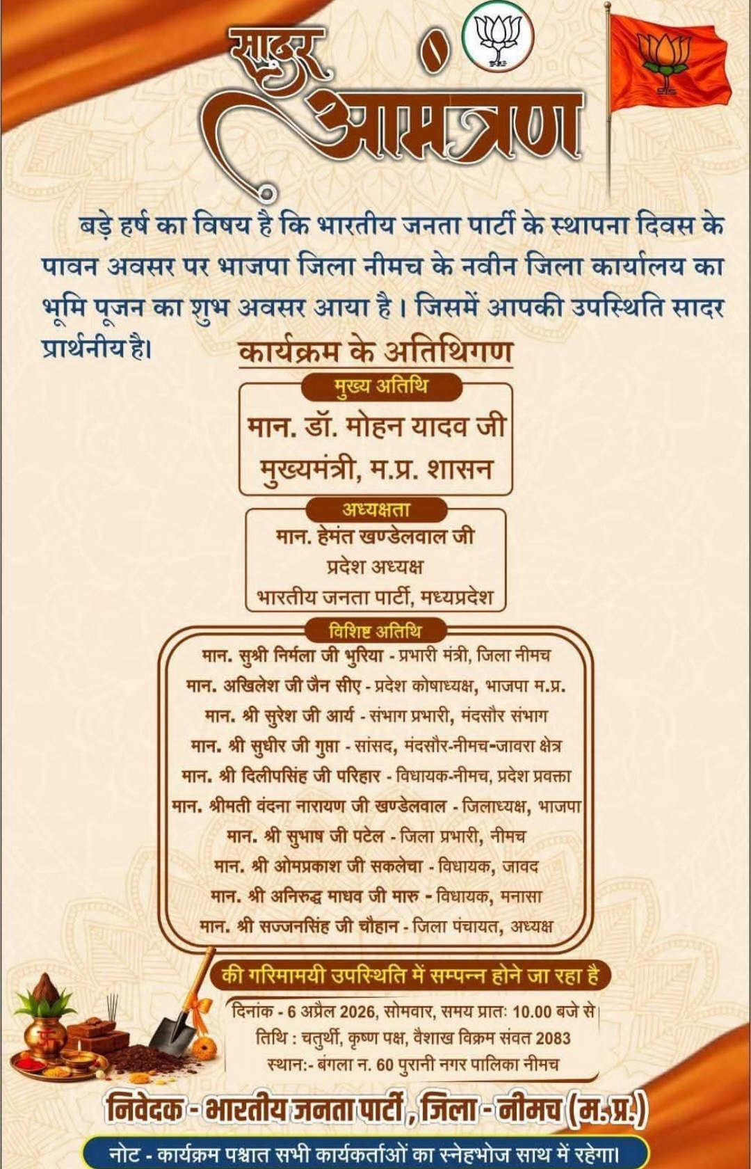 नीमच। 6 अप्रैल सोमवार 2026 को प्रात: 11 बजे भाजपा के स्थापना दिवस के अवसर पर जिले के नवीन कार्यालय भवन का भूमि पुजन समारोह प्रदेश के यशस्वीप मुख्यमंत्री माननीय श्री मोहन यादव एवं भाजपा प्रदेशअध्यक्ष श्री हेमंत खंडेलवाल के कर कमलों से वचुर्अल माध्यम से संपन्न होगा । इस भव्य ऐतिहासिक अवसर पर जिले की प्रभारी मंत्री सुश्री निर्मला भुरिया, प्रदेश कोषाध्यक्ष श्री अखिलेश जैन सीए, मंदसौर संभाग प्रभारी श्री सुरेश आर्य, सांसद श्री सुधीर गुप्ता , प्रदेश भाजपा प्रवक्ता व विधायक श्री दिलीपसिंह परिहार, भाजपा जिलाध्यक्ष श्रीमती वंदना नारायण खंडेलवाल, जिला प्रभारी पुर्व सांसद श्री सुभाष पटेल, विधायक जावद श्री ओमप्रकाश सकलेचा, विधायक मनासा श्री अनिरूद्ध माधव मारू, जिला पंचायत अध्यक्ष श्री सज्जनसिंह चौहान, मंचासिन रहेंगे। प्रेस को जारी विज्ञप्ति में भारतीय जनता पार्टी जिला नीमच के जिला मीडिया प्रभारी श्री मनोज माहेश्वरी व सह प्रभारी श्री शुभम शर्मा ने संयुक्त रूप से बताया की जिला भाजपा का यह नवीन कार्यालय भवन मालवा के गांधी डॉ लक्ष्मीनारायण पाण्डे मार्ग पर स्थित बंगला नं. 60 पुरानी नगरपालिका परिसर नीमच में बनने जा रहा है । इस कार्यक्रम को लेकर जिले भर के भाजपाजनों में अपार उत्साह देखा जा रहा है । अत: जिले के समस्त भाजपा जिला, मण्डल, मोर्चा, प्रकोष्ठ, प्रत्येक बूथ के पदाधिकारीगण, जिला पंचायत, जनपद पंचायत, व ग्राम पंचायत, नगरपालिका, नगर परिषद, सरपंचगण, तमाम जन प्रतिनिधीगण, और जिले भर के सभी कार्यकर्ता बंधुओं, बहनों से आग्रह है कि 6 अप्रैल स्थापना दिवस को आयोजित इस भव्य विराट समारोह में आप सभी जन अवश्य सहभागी बने और कार्यक्रम को सफल बनावे।