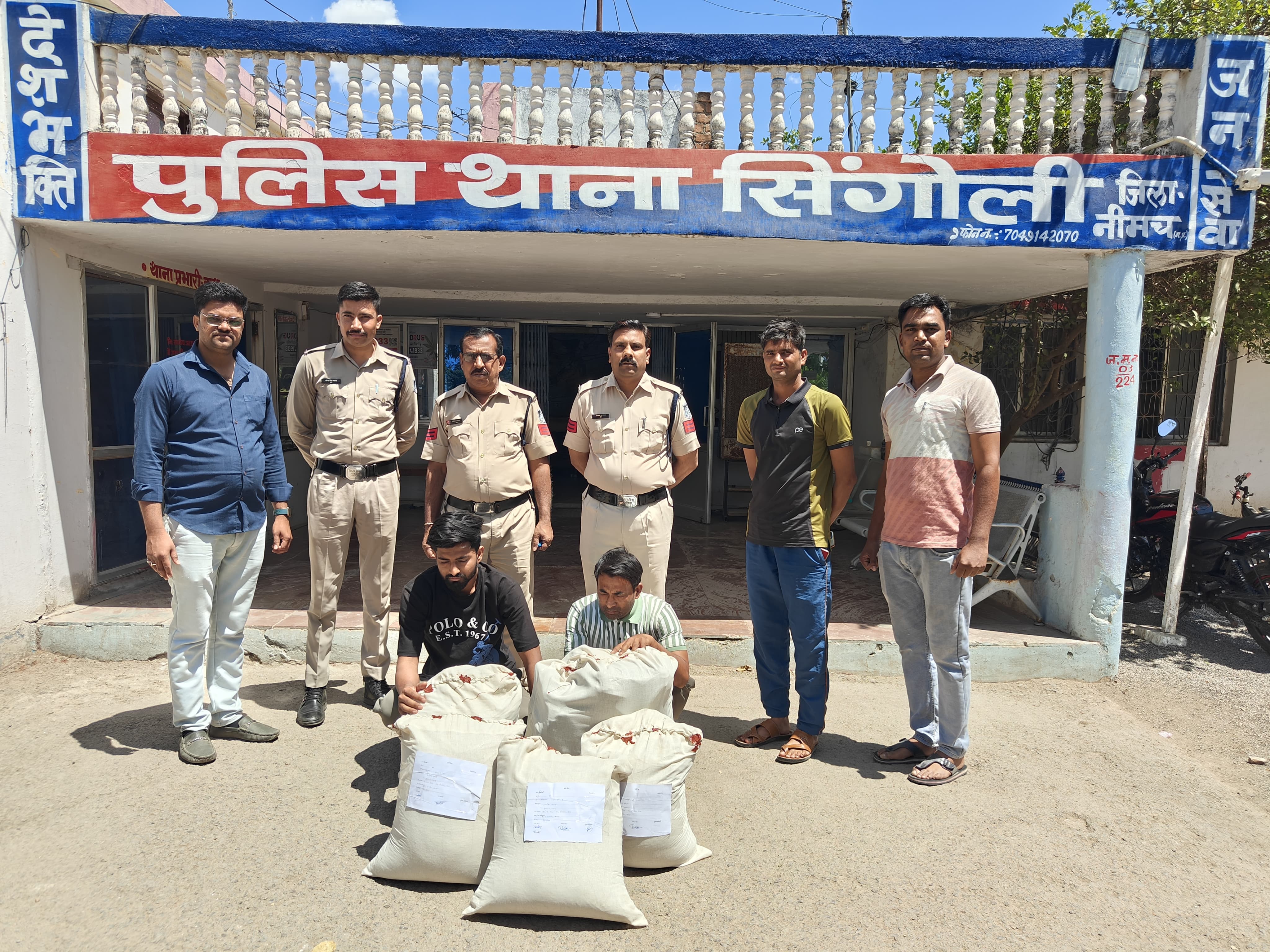 दिनांक 04.04.2026 को वाहन चैकिंग हेतू ग्राम धोगवा राजस्थान सीमा पहुँचे जहाँ पुलिस बल द्वारा वाहन चेकिंग बाद हमराह बल शासकीय वाहन के वापस थाना सिंगोली आते समय ग्राम धोगवा के यात्री प्रतिक्षालय के अन्दर दो व्यक्ति दोनो एक एक बैग हाथ में तथा एक एक पिठ्ठू बैग पीठ पर टांगे हुवे संदिग्ध अवस्था में खड़े थे पुलिस की गाड़ी व पुलिस को देखकर दोनो व्यक्ति भागने की कोशिश करने लगे शंका होने पर शासकीय वाहन व फोर्स, पंचान की मदद से आरोपियो बलदेव सिंह व सुनील कुमार के कब्जे से 42.200 किलोग्राम अवैध पीसा मादक पदार्थ जप्त कर आरोपियो 01. बलदेव सिंह पिता ईश्वर सिंह जाति रायसिख सरदार उम्र 35 साल निवासी वार्ड न. 3SRW राठीखेडा तहसील थाना टिब्बी जिला हनुमानगढ़ राजस्थान हालमुकाम पुलिस चौकी सुरेशिया के पास गुरुद्वारे का मकान हनुमानगढ़ राजस्थान 02 सुनील कुमार पिता हंसराज देवव्रत जाति जाट उम्र 24 साल निवासी 3 लीलावती वार्ड न. 05 थाना संगरिया जिला हनुमानगढ़ राजस्थान को गिरफ्तार किया गया है। आरोपियो से जप्तशुदा अवैध पीसा मादक पदार्थ के स्त्रोतो के संबंध मे पुछताछ कर अग्रिम कार्यवाही की जा रही है।