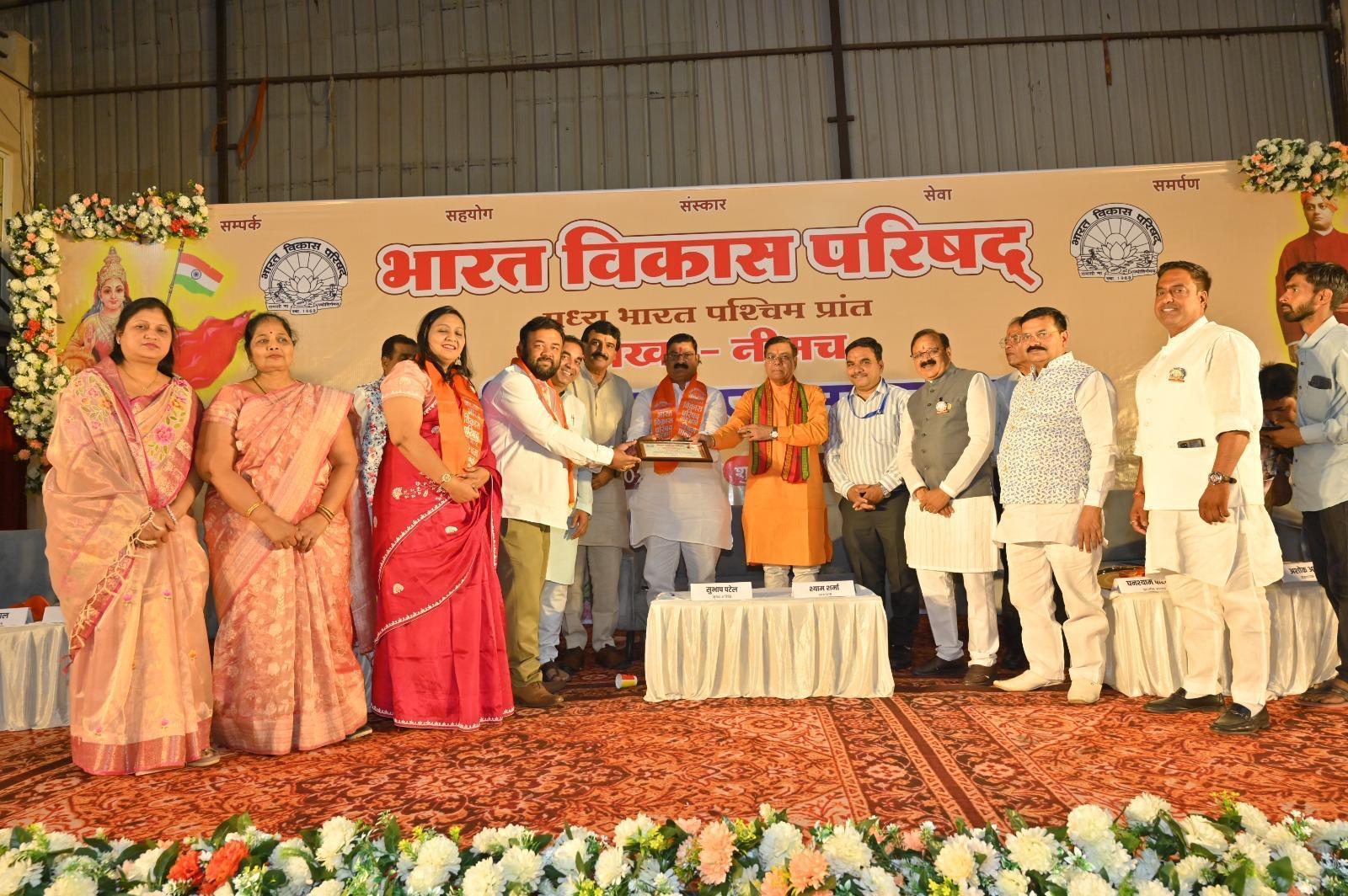 दायित्व ग्रहण समारोह के मुख्य अतिथि सुभाष जी पटेल पूर्व सांसद एवं भाजपा जिला संगठन प्रभारी नीमच ने अपने उद्बोधन में बताया कि हजारों वर्षों तक भारत की संस्कृति को नष्ट करने के लिए मुगलों और अंग्रेजों ने अनेक प्रयास किए लेकिन भारतीय संस्कृति सेवा की संस्कृति है जो आज भी अमिट है। भारतीय संस्कृति से पूरा विश्व वसुदेव कुटुंबकम की प्रेरणा लेता है जो सभी के लिए प्रेरणादाई है । कार्यक्रम के विशिष्ट अतिथि एवं शाखा परिवार के सदस्य नीमच के लोकप्रिय विधायक दिलीप सिंह जी परिहार ने अपने उद्बोधन में बताया कि परिषद द्वारा महापुरुषों स्वामी विवेकानंद, छत्रपति शिवाजी, वीर सावरकर आदि की प्रतिमाएं स्थापित की गई है। परिषद प्रयास कर आगामी दिनों में झांसी की रानी लक्ष्मी बाई की प्रतिमा स्थापित करने का लक्ष्य रखें तो युवा पीढ़ी महापुरुषों के जीवन के चरित्र से अवगत होगी । इसके लिए उन्होंने विधायक निधि से आर्थिक सहयोग की बात भी कहीं। कार्यक्रम के विशिष्ट अतिथि मध्य भारत पश्चिम प्रांत के प्रांतीय अध्यक्ष घनश्याम जी पोरवाल मंदसौर ने कहा कि परिषद द्वारा पिछले वर्ष सेवा के अनेक कार्य कर नीमच शाखा ने एक अलग पहचान बनाई है । नई कार्यकारिणी सेवा अभियान को नई ऊंचाइयों प्रदान करेगी । कार्यक्रम की विशिष्ट अतिथि नगर पालिका अध्यक्ष श्रीमती स्वाति गौरव जी चोपड़ा ने कहा कि मेरा परिवार भारत विकास परिषद से शुरू से ही जुड़ा रहा है और परिषद सेवा कार्यों से समाज में नई ऊंचाइयां प्राप्त कर रहा है। परिषद परिवार के सभी सदस्य सक्रियता से समाज सेवा के कार्यों में लगे हुए हैं। निवर्तमान अध्यक्ष रवि पोरवाल ने स्वागत उद्बोधन एवं निवर्तमान सचिव पिंटू शर्मा ने परिषद द्वारा वर्ष भर की गई गतिविधियों का प्रतिवेदन प्रस्तुत किया। नवीन अध्यक्ष पुरुषोत्तम गुप्ता ने अपनी आगामी कार्यों की अभिलाषा बताते हुए कहा कि परिषद टीम भावना के साथ सभी सेवा प्रकल्प को निर्धारित समय में पूरा कर सेवा के नए कीर्तिमान स्थापित करेगी एवं स्थाई प्रकल्पों पर जोर देगी। रीजनल सचिव संपर्क एवं कार्यक्रम के शपथ अधिकारी प्रदीप चोपड़ा (जावद) ने समाज सेवा राष्ट्र विकास की शपथ नवनिर्वाचित अध्यक्ष पुरुषोत्तम गुप्ता व उनकी टीम एवं महिला संयोजिका श्रीमती सुनीता चौधरी एवं उनकी टीम को दिलाते हुए कहा कि नई कार्यकारिणी नया नेतृत्व परिषद को नई ऊर्जा प्रदान करेगा और समाज को सेवा के नए प्रकल्पों से विकास के लिए प्रोत्साहन प्रदान करेगा। कार्यक्रम मे संस्थापक अध्यक्ष अशोक अग्रवाल और प्रांतीय संरक्षक सुनील सिंहल ने भी अपने विचार व्यक्त किए और परिषद परिवार को बधाई दी।अतिथियों को भारतीय परंपरा अनुसार मस्तक पर तिलक लगाकर, दुपट्टे और मोतियों की माला 