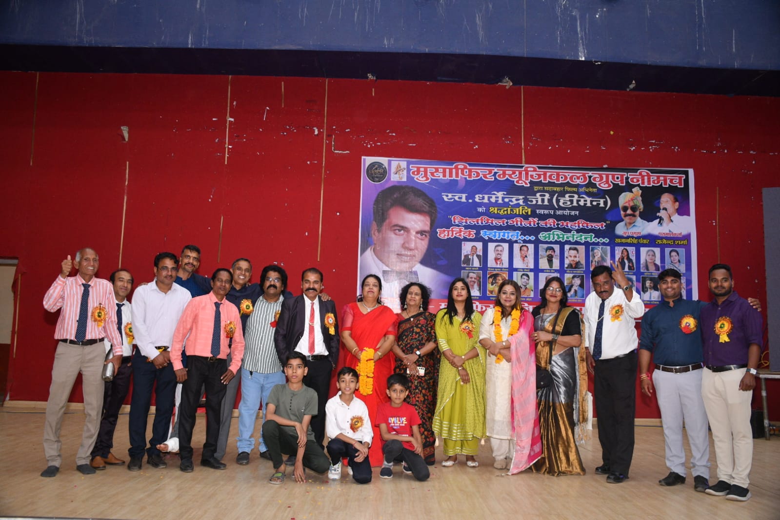 नीमच- मुसाफिर म्यूजिकल ग्रुप नीमच द्वारा फिल्म अभिनेता धर्मेंद्र को 4 अप्रैल शनिवार रात्रि 8:00 बजे स्थान टाउन हॉल नीमच में झिलमिल गीतों की महफिल कार्यक्रम द्वारा संगीतमय भावभीनी श्रद्धांजलि दी गई..