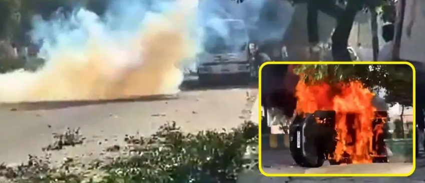 पुलिस गाड़ियों में आगजनी से बिगड़ा माहौल
